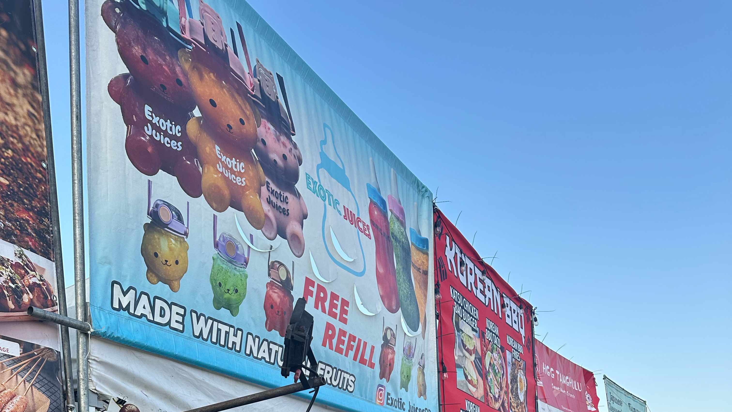 また、来場者の多くが肩からかけていたのがこのExotic Juicesです。大きなクマ型や、哺乳瓶型の容器にフルーツジュースを入れて販売しており、とにかく見た目がインパクト大!この屋台は様々なイベントに出展しているので、1度この大きな容器を買えば無料でリフィルをしてくれるとのことでした。他にも、イカや焼き鳥、唐揚げ、たこ焼きなどおかず系も豊富に取り揃えており、ヒスパニック系やアジア系の方々が多く来場していました。